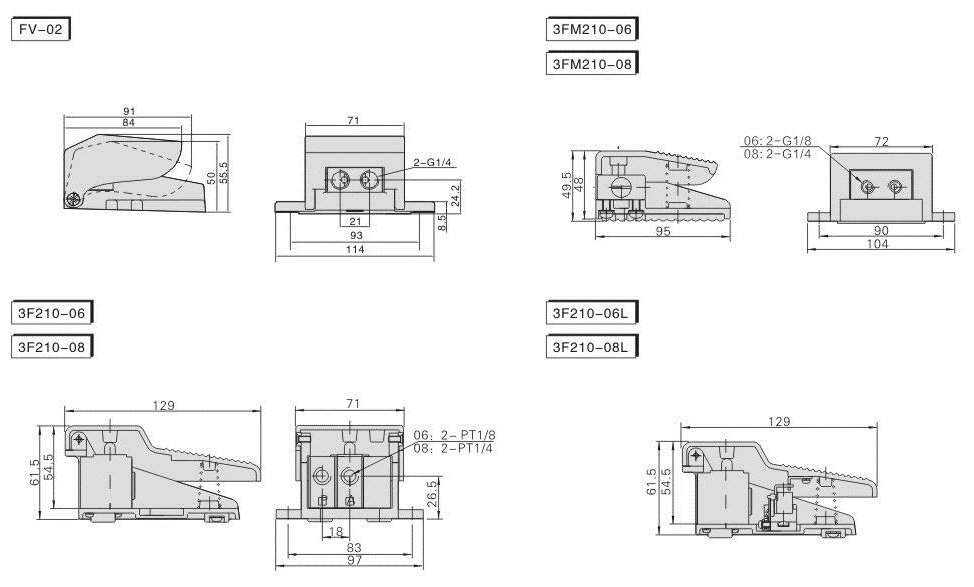Dimension for FV-02 pneumatic foot operated pedal valve